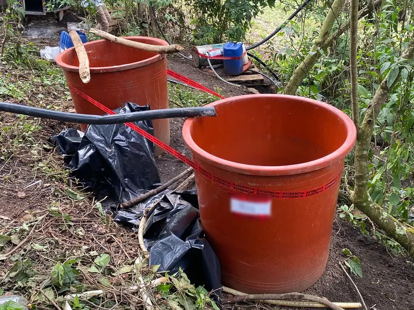 Por estos hechos, la PFM y Servicios Periciales, en coordinación con la Secretaría de la Defensa Nacional (Defensa), Guardia Nacional (GN) y Secretaría de Seguridad del Pueblo (SSP), localizaron un predio abierto, en tierras de uso común del ejido, en donde se aseguraron bidones y tambos vacíos, una estructura metálica con un recipiente con capacidad de mil litros que contenía en su interior un líquido (químico) así como un motor y un cilindro de gas, bolsas de plástico que contenían una sustancia con la leyenda de cloruro de calcio y sosa cáustica, conexiones, mangueras y equipos reactores, entre otros.